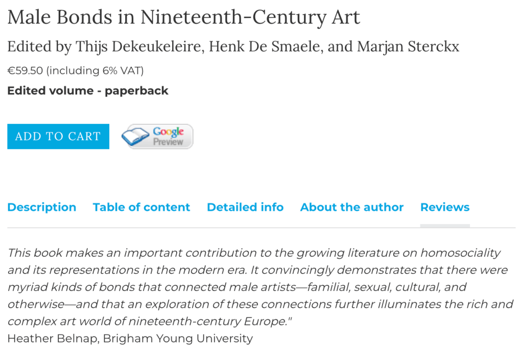 Thijs Dekeukeleire, Henk De Smaele, and Marjan Sterckx. Male Bonds in Nineteenth-century Art. Leuven: Leuven University Press, 2021.